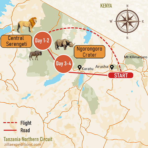 Wake up to the distant roar of lions as the golden sun spills over the Serengeti plains. In just four days, you’ll explore two of Africa’s most amazing places, Serengeti and Ngorongoro, making sure you catch every special moment.